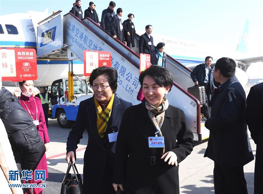 3月2日,出席十二屆全國人大五次會議的吉林代表團(tuán)乘飛機(jī)抵達(dá)北京。新華社記者趙穎全攝