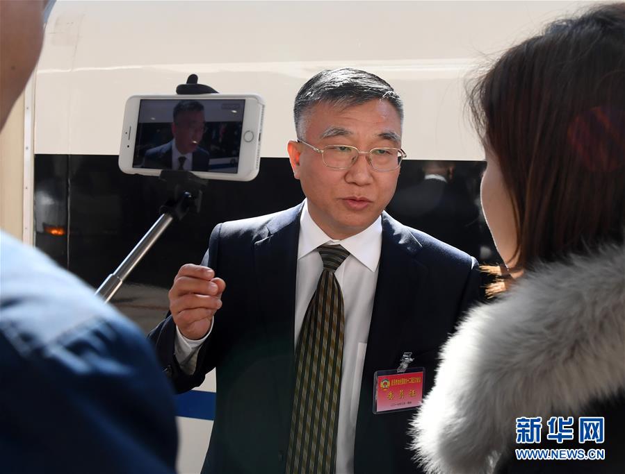 3月2日,出席十二屆全國人大五次會議的黑龍江代表團(tuán)乘坐火車抵達(dá)北京站。這是全國人大代表王景海在接受記者采訪。 新華社記者 金立旺 攝