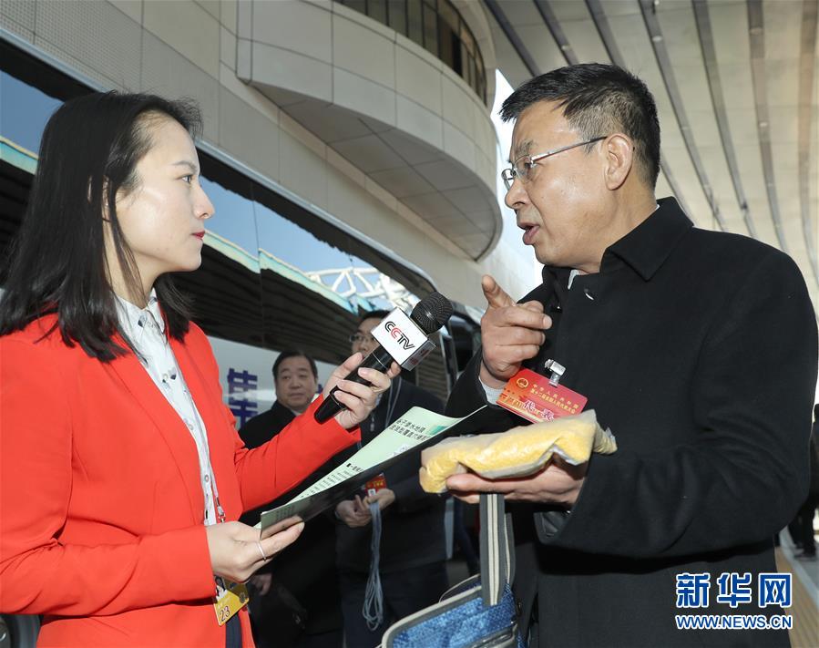 3月2日,出席十二屆全國人大五次會議的山西代表團(tuán)乘坐火車抵達(dá)北京西站。這是全國人大代表姚建民(右)在接受記者采訪。 新華社記者 陳建力攝