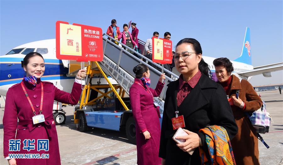 3月2日,出席十二屆全國人大五次會議的廣西代表團(tuán)乘坐飛機(jī)抵達(dá)北京。新華社記者趙穎全攝