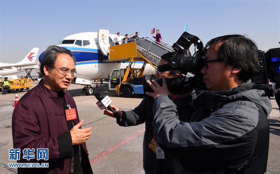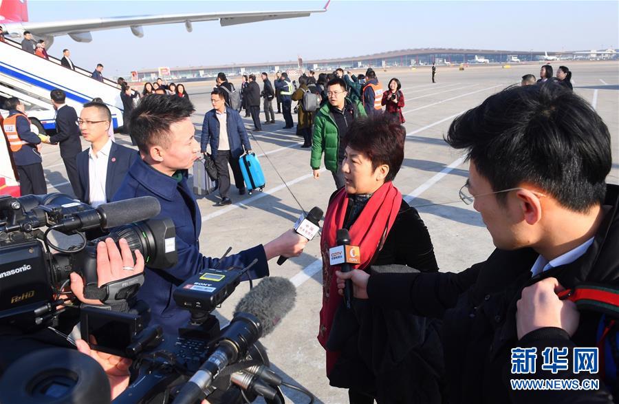 3月2日,出席十二屆全國人大五次會議的四川代表團(tuán)乘坐飛機(jī)抵達(dá)北京。這是全國人大代表包惠(前右二)接受記者采訪。 新華社記者趙穎全攝