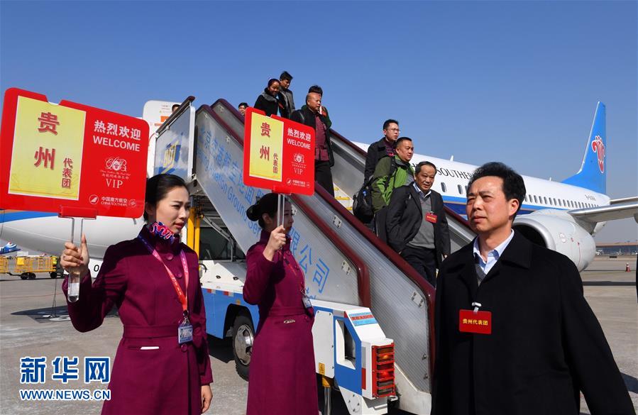 3月2日,出席十二屆全國人大五次會議的貴州代表團(tuán)乘坐飛機(jī)抵達(dá)北京。新華社記者趙穎全攝