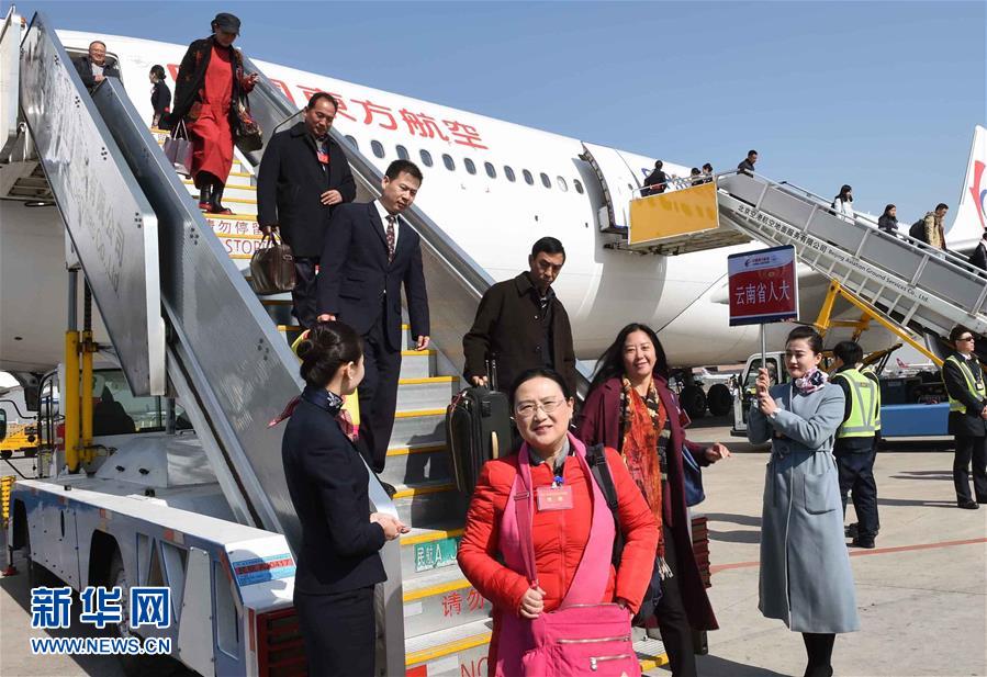 3月2日,出席十二屆全國人大五次會議的云南代表團(tuán)乘坐飛機(jī)抵達(dá)北京。新華社記者楊宗友攝