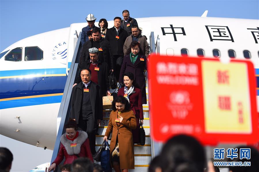 3月2日,出席十二屆全國人大五次會議的新疆代表團(tuán)乘坐飛機(jī)抵達(dá)北京。新華社記者陳曄華攝