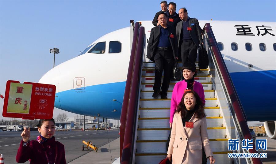 3月2日,出席十二屆全國人大五次會議的重慶代表團(tuán)乘坐飛機(jī)抵達(dá)北京。新華社記者趙穎全攝