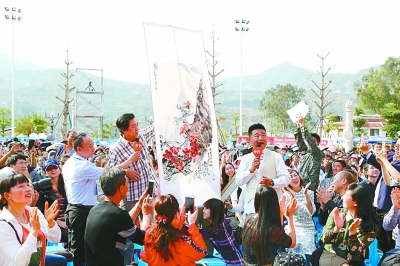 《鄉(xiāng)約》在攀枝花市東區(qū)錄制現(xiàn)場(chǎng),當(dāng)?shù)厮囆g(shù)家向主持人展示書畫作品。 馮明仕攝/光明圖片