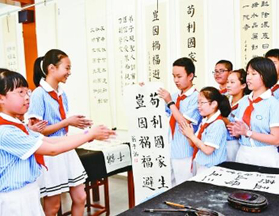 福州市瑯岐實(shí)驗(yàn)小學(xué),同學(xué)們在展示自己書寫的名人家風(fēng)家訓(xùn)。新華社發(fā)