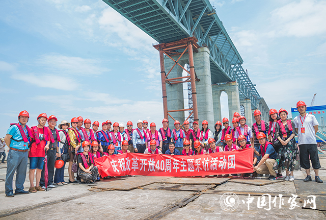 采訪團(tuán)采訪公鐵大橋建設(shè)指揮部并在建設(shè)中的公鐵大橋上合影