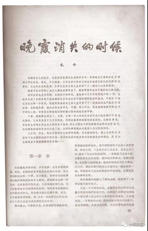 《十月》這個(gè)刊名,鮮明地體現(xiàn)了那個(gè)時(shí)代的精神氣質(zhì)——它蘊(yùn)含了一目了然又豐富無(wú)比的時(shí)代信息。在一個(gè)金色的季節(jié),中國(guó)人民和中國(guó)文學(xué)一起告別了過(guò)去,迎接一個(gè)與這個(gè)季節(jié)一樣輝煌的新時(shí)代。因此,“十月”是莊嚴(yán)和正大,是浪漫和激情,是鮮花和淚水,是飄揚(yáng)的文學(xué)旗幟和火炬。它在北京的金秋迎風(fēng)招展,吸引的卻是全國(guó)文學(xué)家和讀者的目光。就這樣,《十月》不僅成了一個(gè)時(shí)代文學(xué)的見證者、推動(dòng)者,重要的它更是一個(gè)參與者和建造者。因此,《十月》的四十年,某種意義上也可以說(shuō)是改革開放四十年文學(xué)的縮影。
