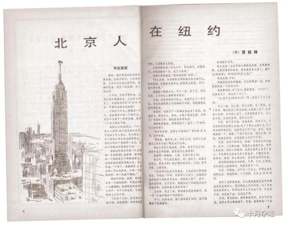 長(zhǎng)篇小說(shuō)也是《十月》的一個(gè)傳統(tǒng)。1981年的四、五兩期,連載了張潔的長(zhǎng)篇小說(shuō)《沉重的翅膀》。這是改革開放以來(lái)第一部以改革為題材的長(zhǎng)篇小說(shuō)。小說(shuō)發(fā)表后雖然引起各方面的爭(zhēng)議甚至非常尖銳,但通過(guò)修訂后,小說(shuō)獲得了第二屆茅盾文學(xué)獎(jiǎng);1983年四期的《十月》,發(fā)表了李國(guó)文的長(zhǎng)篇小說(shuō)《花園街五號(hào)》。小說(shuō)通過(guò)一座特殊建筑發(fā)生的故事,深刻而生動(dòng)地講述了政治文化與社會(huì)歷史變革的關(guān)系。那里既有刀光劍影鐵血交鋒,亦有英雄氣短兒女情長(zhǎng)。它實(shí)現(xiàn)了作家通過(guò)小說(shuō)“是想為在這場(chǎng)變革中,披荊斬棘,沖鋒陷陣的勇士、斗士唱一支贊歌”,“是替他們吶喊:大家來(lái)關(guān)心這場(chǎng)改革,支持這場(chǎng)改革,并且投身到這場(chǎng)改革洪流中來(lái)”(李國(guó)文語(yǔ))的情懷和期許;1991年四期,《十月》發(fā)表了曹桂林的《北京人在紐約》。小說(shuō)開啟了另外一種風(fēng)尚,這種風(fēng)尚可以概括為中國(guó)人在美國(guó)的成功想象。那個(gè)時(shí)代,文學(xué)界有一種強(qiáng)烈的“走向世界”的渴望,有一種強(qiáng)烈的被強(qiáng)勢(shì)文化承認(rèn)的心理要求。這種欲望或訴求本身,同樣隱含著一種“悲情”歷史的文化背景:越是缺乏什么就越是要突顯什么。因此它是“承認(rèn)的政治”的文化心理在文學(xué)上的表達(dá)。小說(shuō)表現(xiàn)的是中國(guó)男人或女人在美國(guó)的成功,尤其是他們商業(yè)的成功。“中國(guó)式的智慧”在異域是否能夠暢行無(wú)阻并不重要,重要的是這些作品使中國(guó)的大眾文化在市場(chǎng)上喜出望外。一時(shí)間里,權(quán)威傳媒響徹著“千萬(wàn)里我追尋著你,可是你卻并不在意”,來(lái)自紐約的神話幾乎家喻戶曉。作品的文學(xué)價(jià)值雖然并不高,它在文化市場(chǎng)的成功,為中國(guó)大眾文化的興起臨時(shí)性地添加了異國(guó)情調(diào)以及中國(guó)人的“美國(guó)想象”。
