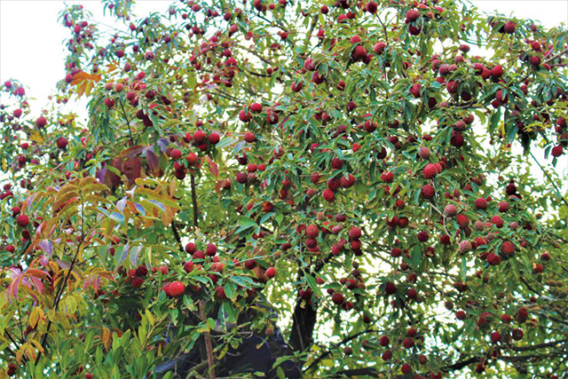 我跟著他往西邊走,約兩公里后,一座扁形的大山突然橫亙在眼前?!翱?,那叫雞素子!”李老抬手指指山腰,又指指山麓的左右兩側(cè)。我一一望去,見每一處都是“萬綠叢中一點(diǎn)紅”,真真切切,非常養(yǎng)眼。山麓左側(cè)的不遠(yuǎn)處,我們走近看,見是一棵斜長在石縫里的彎樹,高約4米,叉枝又生叉枝,枝條密匝,其上綴著大小形狀均如荔枝的果兒,無以計(jì)數(shù),紅紅火火,令人心曠神怡。
