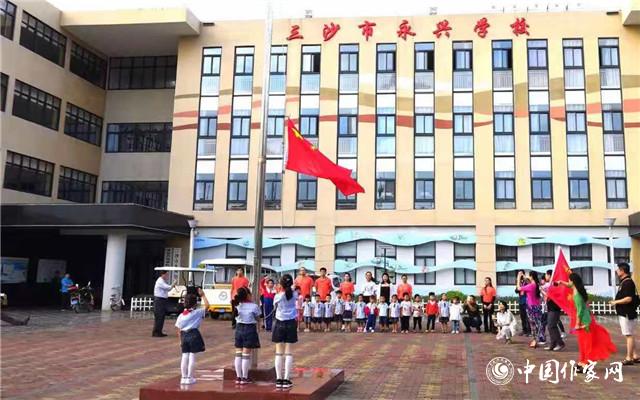 采訪團(tuán)第一站來到三沙市永興學(xué)校,當(dāng)時正是早上8點(diǎn)鐘,學(xué)校的孩子們正在樓前的空地舉行升旗儀式,采訪團(tuán)的團(tuán)員們也加入了升旗的隊(duì)伍,向著國旗行注目禮。隨后,采訪團(tuán)成員參觀了學(xué)校的教學(xué)場所和辦學(xué)展覽,觀看了學(xué)生制作的各種手工作品。永興學(xué)校是中國最南端的學(xué)校,于2015年投入使用,目前學(xué)校有27名學(xué)生,都是漁民和守島軍人的子弟,畢業(yè)于瓊臺師范學(xué)院的10名教師在此執(zhí)教。作家們與老師和學(xué)生交談中,感受到了永興學(xué)校的不一樣的情懷。作家王松告訴記者,“看到那個升旗手踮著腳尖小心翼翼地把國旗的繩子拴好……我不禁流淚了,到這里的每一刻,都能強(qiáng)烈地感覺到‘愛國’這兩個字?!?/p>