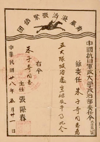 中國抗日軍政大學(xué)政治對朱子奇的委任令