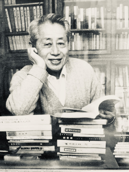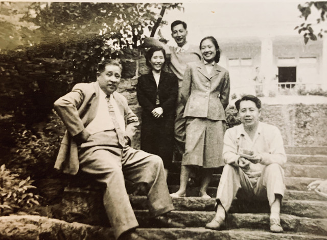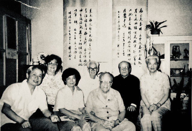 1988年6月19日,愛潑斯坦(前排右一)和夫人黃浣碧、美國老友安布德大夫和夫人蘇菲亞、文化部副部長姚仲明(后右二)和朱子奇、陸璀合影于菊兒小院。