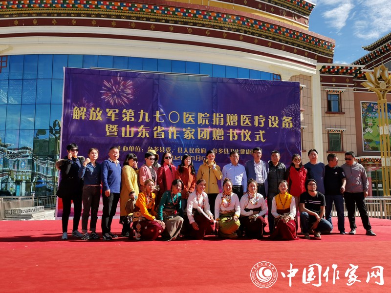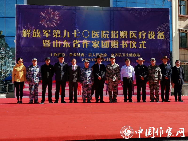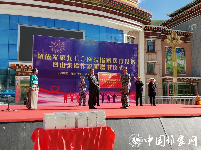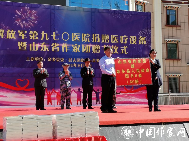 8月6日上午,“解放軍第970醫(yī)院醫(yī)療設(shè)備捐贈(zèng)及山東省作家團(tuán)贈(zèng)書儀式”在雜多縣文化廣場上舉行。山東作家們以“守護(hù)希望、筑夢未來”為宗旨,為雜多縣的孩子們贈(zèng)送了一批圖書。葛長偉在致辭中表示:“此次攜作家團(tuán)來到美麗的瀾滄江源頭,將以民族情感為紐帶,用文字銘刻瀾滄文化,為雜多的蓬勃發(fā)展貢獻(xiàn)力量?!眱x式上,雜多縣向山東省作協(xié)回贈(zèng)錦旗:“巍巍泰山情系雪域高原 瀾滄江源筆繪脫貧攻堅(jiān)”。