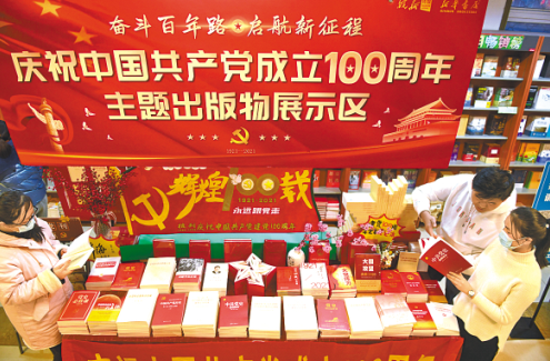 安徽省阜陽市新華書店“奮斗百年路 啟航新征程”慶祝中國共產(chǎn)黨成立100周年主題出版物展示區(qū),讀者在選購黨史黨建書籍。王彪 攝