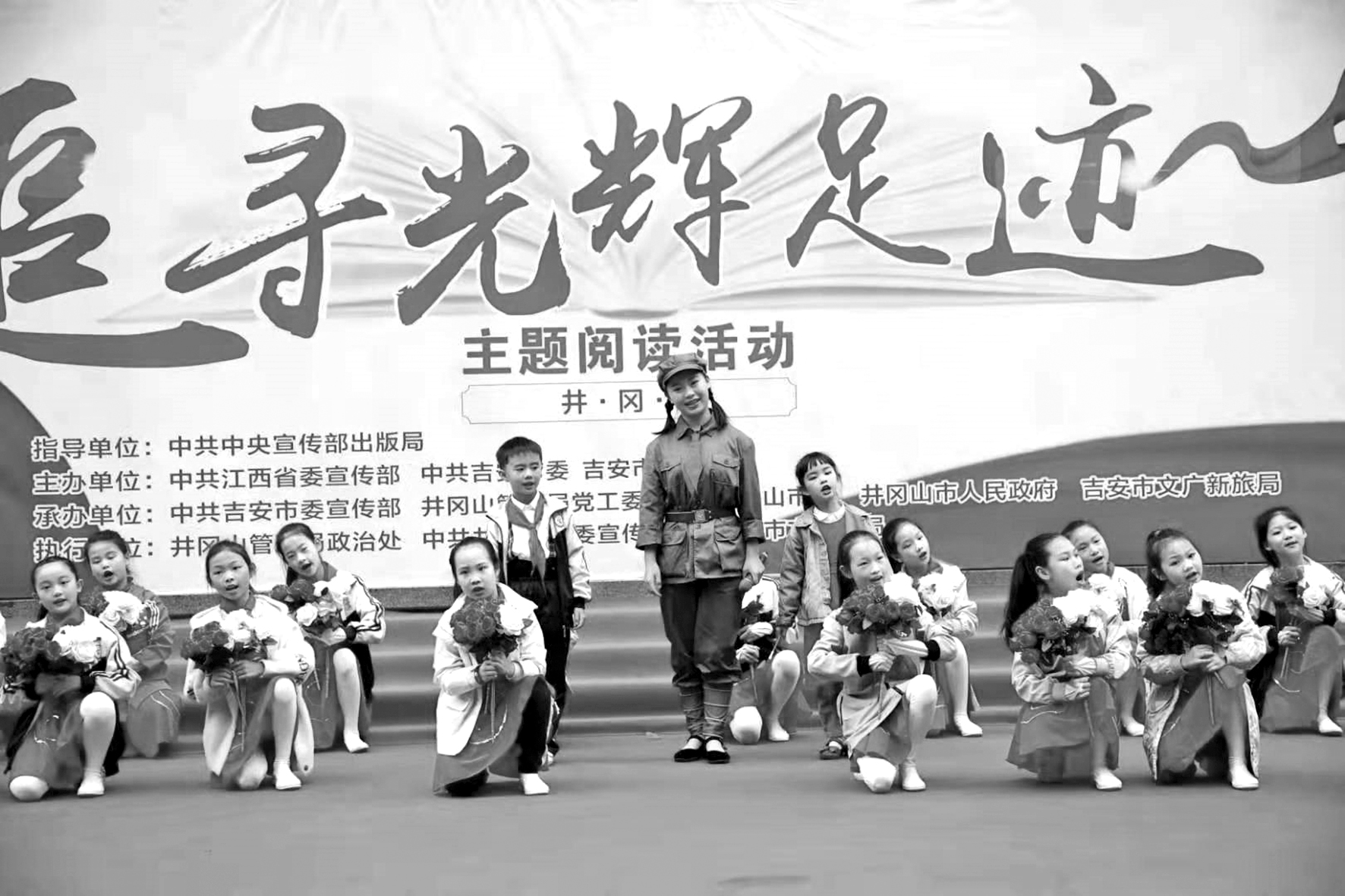 ▲ 井岡山實驗小學(xué)的學(xué)生在“追尋光輝足跡”主題閱讀活動啟動儀式上表演歌舞《唱支山歌給黨聽》