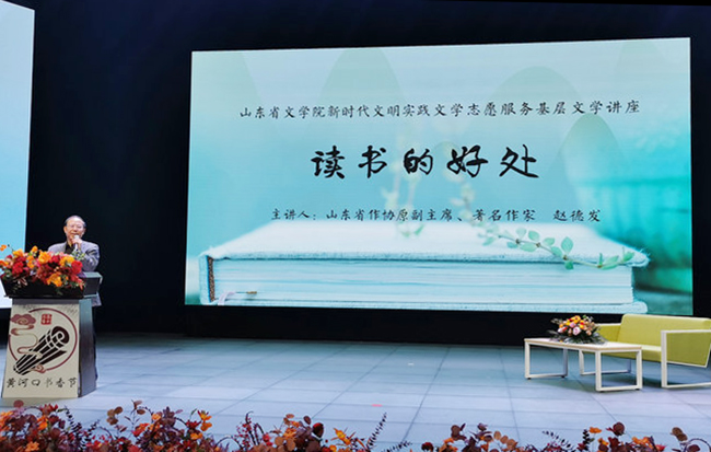 本次活動邀請到了山東省作家協(xié)會原副主席、著名作家趙德發(fā),山東省作家協(xié)會副主席、著名作家鐵流作為志愿者代表,在墾利區(qū)分別為基層作家和文學愛好者以及墾利一中的部分同學們帶來了生動的文學講座。講座由山東省作家協(xié)會主席團成員、著名作家東紫主持。趙德發(fā)以“讀書的好處”為題,與現(xiàn)場文學愛好者分享了自己的讀書心得以及《經山?!穭?chuàng)作經歷。鐵流以“紅色經典依然具有強大的生命力”為題,與同學們分享了許多紅色經典故事,通過故事讓同學們體會思考我們現(xiàn)在生活的來之不易。講座結束后,文學院進行了關于新時代文明實踐活動以及培訓工作的專題調研,調研活動取得了預期效果,基層作家提出多條意見建議,對下一步工作具有較強的參考意義。
