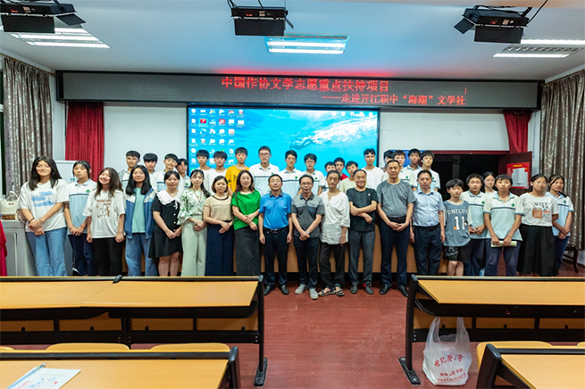 6月27日,中國(guó)作協(xié)文學(xué)志愿服務(wù)示范性重點(diǎn)扶持項(xiàng)目——四川省達(dá)州市開(kāi)江縣校園文學(xué)大講堂在縣職業(yè)中學(xué)舉行。來(lái)自開(kāi)江縣作家協(xié)會(huì)的文學(xué)志愿者:縣文聯(lián)副主席武禮建、縣作協(xié)主席林佐成、縣作協(xié)副主席何云帆、彭輝、劉春風(fēng)、譚杰及開(kāi)江中學(xué)“新星”文學(xué)社社長(zhǎng)曾瑜、縣作家協(xié)會(huì)會(huì)員錢(qián)良勝、艾雪和開(kāi)江縣職業(yè)中學(xué)“海潮”文學(xué)社100多位社員參加了此次講座。開(kāi)江縣職業(yè)中學(xué)“海潮”文學(xué)社社長(zhǎng)唐秘主持本次講座。