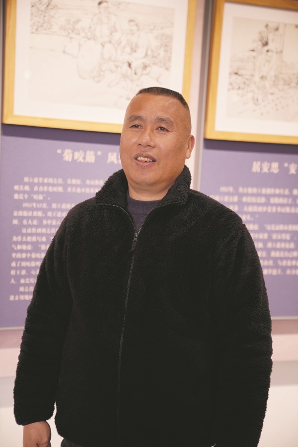 “為人民創(chuàng)作、為時代放歌?!睍菡醒?,周立波卷起褲腿,在田間地里勞動之余小憩的照片,生動詮釋了這10個字的內涵。作為書屋講解員,卜雪斌每每都會將游客攏在這幅畫像前,自豪地介紹“老鄉(xiāng)”周立波與清溪村的故事。他一口夾雜益陽口音的普通話,時不時逗笑遠道而來的眾人?!拔矣闷胀ㄔ捴v《山鄉(xiāng)巨變》,來這里的游客大多都了解,可能也就愛買不買;但用益陽話講《山鄉(xiāng)巨變》的故事,讀者聽得可有滋味了,就覺得非買不可了。那我這個‘貨’就帶成功了?!辈费┍笮χf。