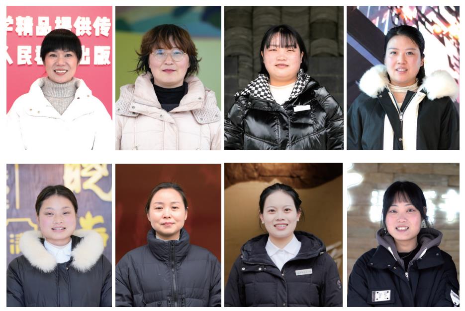 第一排(從左至右):劉勝男(作家出版社書(shū)屋)、李群芳(兒童文學(xué)書(shū)屋)、郭蓉(王躍文書(shū)屋)、李葉青(劉慈欣書(shū)屋);第二排(從左至右):鄧佩玲(梁曉聲書(shū)屋)、姚小玲(莫言書(shū)屋)、徐英(賈平凹書(shū)屋)、繆青湘(劉震云書(shū)屋)