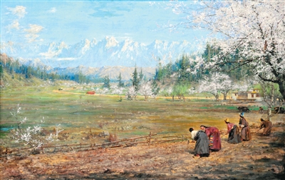 這一時(shí)期,描繪西藏題材的美術(shù)創(chuàng)作宏富,尤以董希文的《春到西藏》最具象征性和吸引力。1954年春,董希文赴康藏寫生兩月余,而后完成《春到西藏》。作品描繪了一幅動(dòng)人的場(chǎng)景:春光明媚,土地復(fù)蘇,杏花樹下勞作的人們起身張望,遠(yuǎn)處新開發(fā)的公路上,汽車川流不息,遠(yuǎn)景是高聳入云的雪峰,恰如其分地展現(xiàn)了西藏人民解放后喜悅昂揚(yáng)的情感意象。董希文將解放和春天聯(lián)系在一起,用汽車和公路寓意新生活,用充滿期待的張望和歡聲笑語表達(dá)了人民的心聲,別開生面。1963年至1964年,董希文油畫《千年土地翻了身》、朱乃正油畫《金色的季節(jié)》、李煥民版畫《初踏黃金路》、郭其祥雕塑《女牧工》、葉淺予中國畫《高原之春》、潘世勛油畫《我們走在大路上》等,都是以明亮的陽光和色彩烘托效果,表現(xiàn)藏族人民解放后的幸福生活和蓬勃的精神面貌。