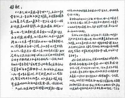 十八年了,我計算您的年齡快七十了。如您還健康,相信在一二年以內(nèi)一定能看到您最喜歡的一個最幼的兒子,而且使您很滿意。他已長大成人,而且十八年來,始終如一地干著一件為了您和中國的一切受苦受難的人們謀幸福、求自由的事情。這個光榮的事業(yè),有無數(shù)的人們,像您兒子一樣的干著。他們更流了無數(shù)的血。但是現(xiàn)在已經(jīng)獲取了初步的成功,這就是把日本強(qiáng)盜打敗,并使中國開始走上和平民主團(tuán)結(jié)統(tǒng)一的道路。我們都是人民的子弟兵!而在許多地方的受苦受難的老百姓,男的女的都翻了身,從受壓迫受窮變成自由幸??鞓返娜?。