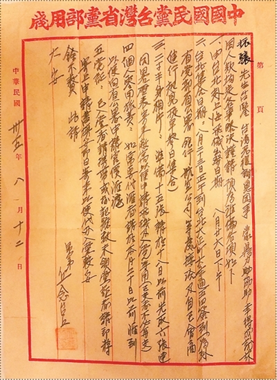 從1946年6月起,丘念臺奔走于各市縣,邀集各地知名人士15人組成“謝恩團(tuán)”,由省議員林獻(xiàn)堂擔(dān)任團(tuán)長。此信就是“謝恩團(tuán)”臨行前夕,丘念臺為籌劃安排出發(fā)事宜給臺灣抗日義士姜紹祖之子、新竹縣參議員姜振驤所寫的信函。信中,從出發(fā)行程到團(tuán)員個人資料準(zhǔn)備,再到個人旅費(fèi)匯寄,各項細(xì)節(jié)都做了精心安排。