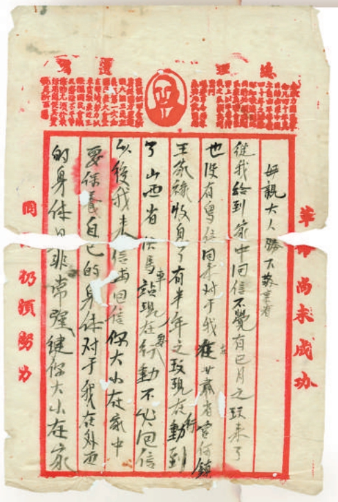 劉中新大概在上世紀二十年代末期參加紅軍,經(jīng)長征到達甘肅、陜北,后在八路軍115師政治部和343旅工作。據(jù)初步考證,此4封信分別寫于1937年9月7日和1938年6月至9月間。其中的第一封家書寫于山西侯馬,當時紅軍剛剛改編為八路軍。1937年9月2日,115師由陜西三原出發(fā)進入山西境內(nèi),在侯馬稍作停留,即北上晉東北抗日前線,9月25日發(fā)起了平型關(guān)戰(zhàn)役。劉中新在這封家書中說:“從我接到家中回信,不覺已有月之久來了,也沒有寫信回來。對于我在甘肅省宮何鎮(zhèn)王家祿收(休)息了有半年之久,現(xiàn)在行動到了山西省侯馬車站?,F(xiàn)在要行動,不必回信,以后我來信再回信。你大小在家中要保養(yǎng)自己的身體,對于我在外面的身體是非常強健,你大小在家不必掛念……現(xiàn)在是全國動員抗戰(zhàn)的時非(候),我在外都是為了抗日救國,不能在家來孝順母親大人,以后回家再來孝順母親大人?,F(xiàn)在我在國民革命軍第八路軍一百一十五師政治部工作……”