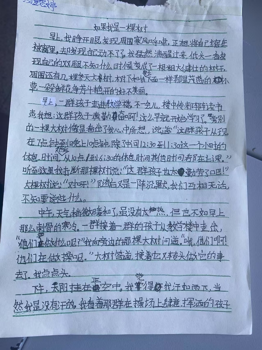 這是左昡的“創(chuàng)作實驗”:她帶著孩子們觀察樹、觸摸樹,有的孩子甚至嘗試了啃樹皮……在嘻嘻哈哈的打鬧中,孩子們的感官世界被打開,與大自然相擁?;氐浇淌?,她在黑板上寫下作文題:如果我是一棵樹。孩子們瞬間安靜下來,教室里安靜到只聽見紙筆摩擦沙沙的聲音。