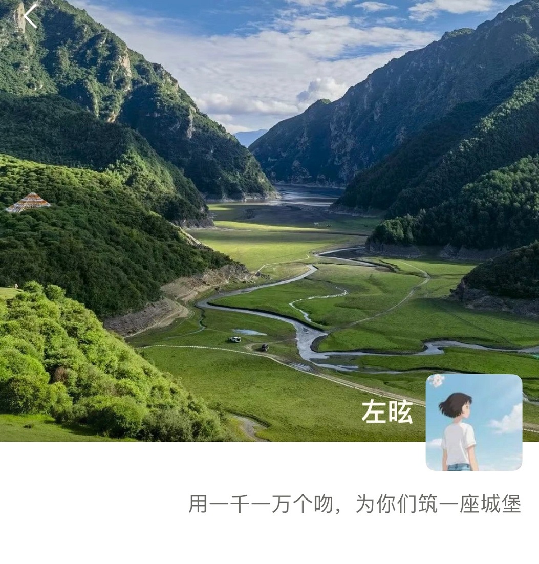 點開左昡的朋友圈,她的背景圖展示的是四面環(huán)山中的蜿蜒公路,這是臨潭冶力關(guān)的風(fēng)景。底下的簽名寫道:“用一千一萬個吻,為你們筑一座城堡?!?/p>