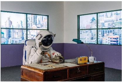 以20世紀(jì)90年代《科幻世界》編輯部為背景的“銀河編輯部”,宇航員正在打電話。圖為2023年“科幻世界·無限”宇宙之門超感科幻大展現(xiàn)場裝置。