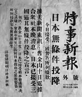 事實上,早在1945年8月10日,日本政府即已分別電請中立國瑞典、瑞士,將其投降之意愿轉(zhuǎn)達(dá)中、美、英、蘇四國,“日本政府決定無條件投降”的消息遂通過無線電波傳遍世界。當(dāng)時,身處中國西南一隅的陳寅恪,究竟通過何種渠道獲知此訊,至今尚未見有確切的考證予以說明。不過,僅據(jù)筆者所知所見,抗戰(zhàn)期間將總部從上海遷至重慶的《時事新報》,確曾于1945年8月10日這一天下午印發(fā)過一份“號外”,日本無條件投降的消息,就赫然印于這份“號外”之上。當(dāng)晚成渝兩地民眾可憑此“號外”,較早獲悉這一消息,確為事實。