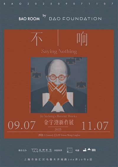 2025年9月,金宇澄在上海珍寶藝術(shù)基金會(huì)舉辦名為“不響”的畫展,畫展的海報(bào)用了和畫冊一樣的自畫像,畫中的金宇澄戴著紅框眼鏡和紅色手套,兩只手捂住了自己的嘴巴。這畫似乎將“不響”具象化了,帶著某種戲謔的態(tài)度。