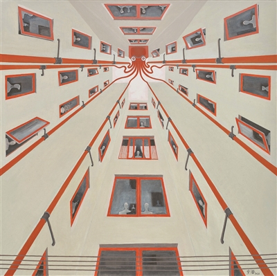 我覺得我畫畫還是興趣在推動(dòng),沒明確要在畫上完成什么,就是拿來就用。比如去年,我畫了一幅自畫像,這幅畫中還有一個(gè)十字形的建筑,我發(fā)現(xiàn)這個(gè)建筑的十字上,好像是章魚的觸角,這個(gè)觸角就是這幢建筑的排水管道,紅色的章魚在十字建筑一個(gè)個(gè)缺口往下看,八根觸須通向各家各戶……