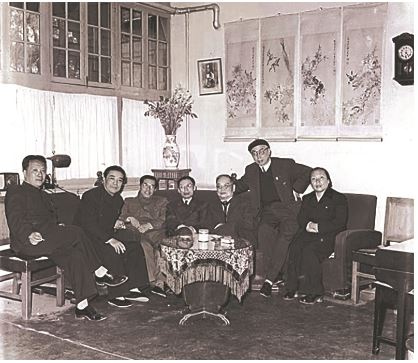 1960年,戲劇家們在北京張自忠路歐陽予倩家中,左起:陳白塵、陽翰笙、張庚、夏衍、歐陽予倩、田漢、李伯釗