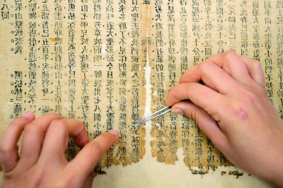 書中用大量筆墨描繪了星光熠熠的修復(fù)師群像。除了潘美娣、杜偉生,還有傳拓大師馬國(guó)慶,他能將西湖的晴、雨、霧、煙波之色,融于墨色的輕重、明暗、虛實(shí)之中;有對(duì)她影響至深的導(dǎo)師胡玉清,手把手教她如何在絮化如棉胎的《唐詩(shī)拾遺》上拼湊出指甲蓋大小的殘片,并灌輸“修合無(wú)人見,存心有天知”的職業(yè)信念;還有已故的趙嘉福先生等老一輩大師,他們將畢生絕學(xué)傾囊相授。這些事例,讓我們看到一項(xiàng)古老技藝是如何在師徒相授、口傳心授中得以薪火相傳。