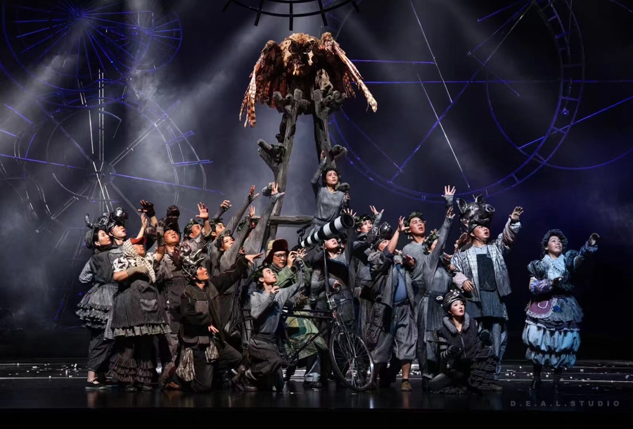 他們的創(chuàng)造是全方位的,編導(dǎo)演、舞美、音樂合流,每一個細部,都充滿了尋常意義上的不確定性。比如對星空的表現(xiàn),最后立到舞臺上的“布景”,竟然沒有一顆星星,全是鄉(xiāng)場上那些水磨、輪盤等農(nóng)具的“機械式”精密組裝。我立即表示認同,這不正是對宇宙抽象、概括而本質(zhì)的理解嗎?浩瀚宇宙,不正是一個“萬有引力”的精密組合體嗎?另外就是觀測,觀測讓我們知道了星空。因此,觀測,才是藝術(shù)家們在戲里的著力點,星空就“留白”給想象力了。