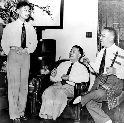 梅蘭芳在北京護(hù)國寺寓所指導(dǎo)梅葆玖吊嗓,王少卿操琴